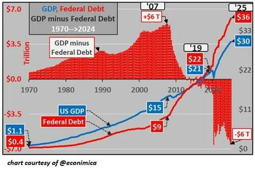 GDP minus federal debt was positive until 2008-09, and has since crashed into deeply negative territory. It's called eating our seed corn, spending money borrowed from future productivity and generations to fund unsustainable consumption today. Spoiler alert: this ends badly.