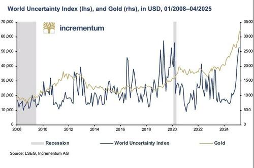 One reason for gold’s strength is its portfolio property as a hedge against (economic) political uncertainties of any kind, whether due to armed conflicts, political crises or trade conflicts. The positive correlation between the gold price in US dollars and the World Uncertainty Index is evident.