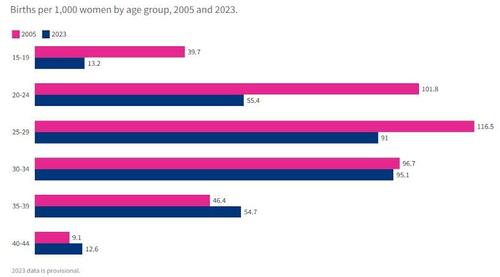 As of 2005, women aged 25–29 had the highest birth rates, at 116.5 births per 1,000 women. By 2023, the peak had shifted to the 30–34 age group, which logged 95.1 births per 1,000 women.