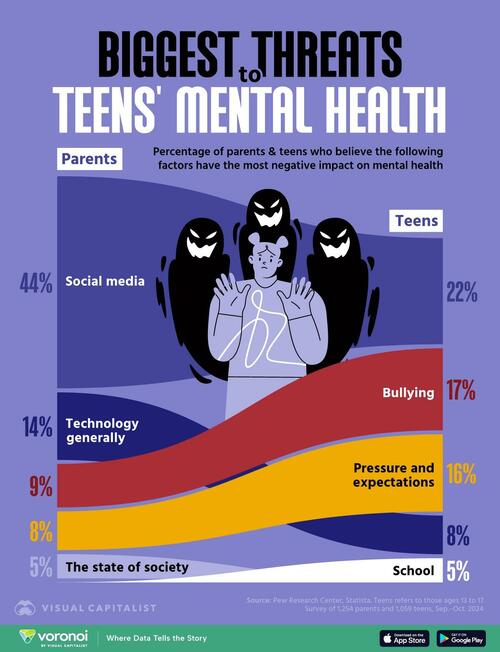 Concerns over teen mental health are growing, but how teens and parents view the root causes can differ significantly. This visualization, via Visual Capitalist's Bruno Venditti, compares their perspectives on what’s driving mental health issues among adolescents.