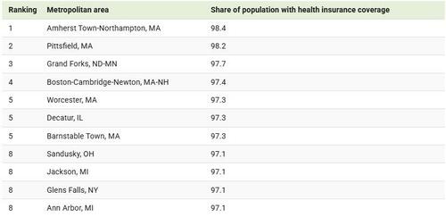 Amherst, Massachusetts was the most insured metro area in the U.S. in 2023, with 98.4% of its residents covered under some sort of health insurance.