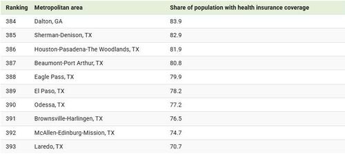 Laredo, a border city in Southern Texas was the metro area with the lowest share of residents with health insurance at 70.7%.