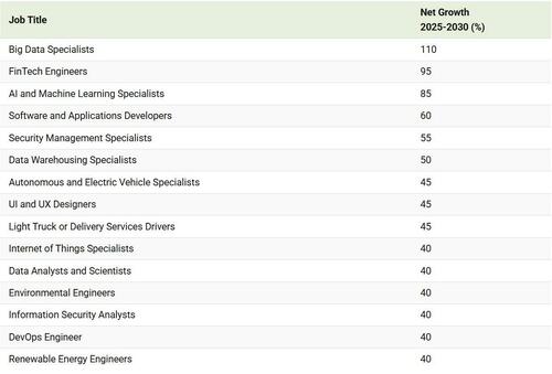 At the top of the list are Big Data Specialists, expected to grow by 110% by 2030. They’re followed by FinTech Engineers (95%) and AI and Machine Learning Specialists (85%).