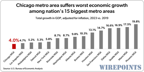 At the core of Chicago’s failure is a lack of economic growth. The metro area’s GDP, after adjusting for inflation, has grown only 4% since 2019. That’s the worst economic growth among the nation’s 15 largest metro areas.