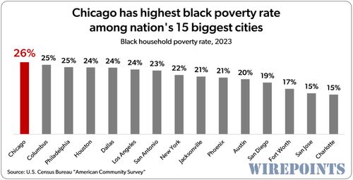 Chicago’s black poverty rate also leads among the nation’s 15 biggest cities. Over 26% of black Chicagoans are below the poverty line – nearly 200,000 people.