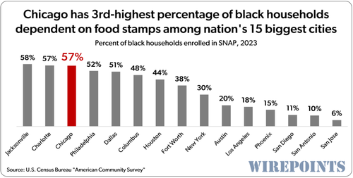 And then there’s government dependency. Nearly 57% of black Chicagoans are enrolled in the food stamp program SNAP – the 3rd-highest percentage among America’s 15 big cities.