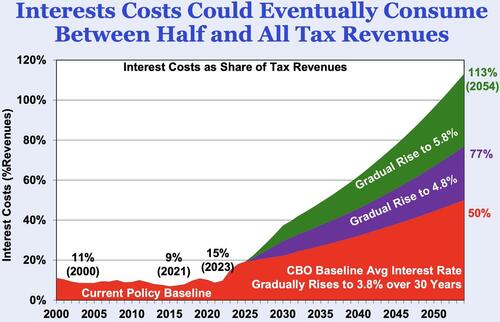 In what may be the most ominous indication that the government is on an autopilot-course for catastrophe, the proportion of total federal outlays driven by mandatory spending has more than doubled since 1965 — from 34% to 73% in 2024. It was at 71% just two years earlier, in 2022.