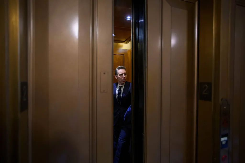 Sen. Josh Hawley, R-Mo., boards an elevator during a vote at the Capitol, Tuesday, Jan. 6, 2026, in Washington