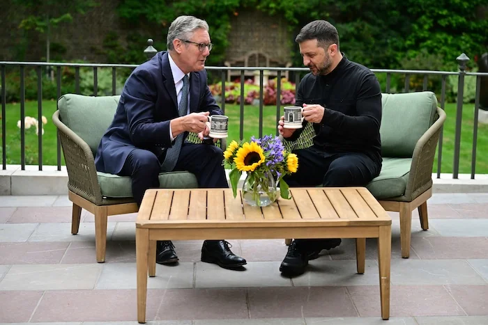 Britain’s Prime Minister Keir Starmer, left, talks with Ukraine’s President Volodymyr Zelensky in the garden of 10 Downing Street in London, Thursday, Aug. 14, 2025. (Ben Stansall/Pool Photo via AP)