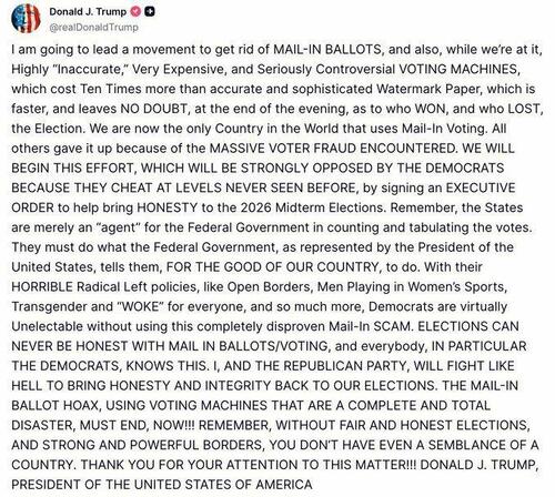 President Donald Trump on Monday vowed to eliminate mail-in voting, and has vowed to “lead a movement” to do so before the 2026 midterms.