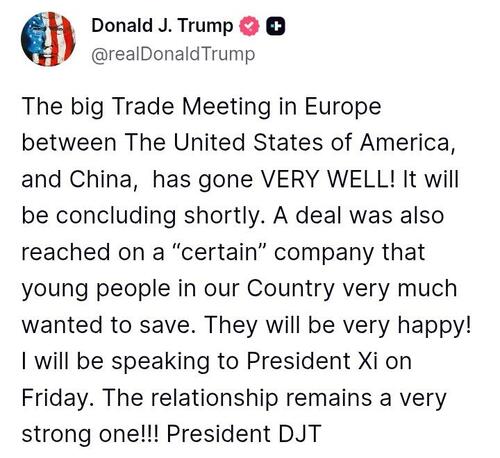 "The big Trade Meeting in Europe between The United States of America, and China, has gone VERY WELL! It will be concluding shortly," Trump posted to Truth Social on Monday, hinting at strong progress on TikTok's future, referencing a "certain company" that young Americans "very much wanted to save" - a yearslong priority of Trump's which hearkens back to his first administration.