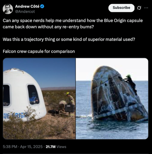 Katy Perry didn’t go to space. Blue Origin barely scraped the Kármán line, then fell back to Earth. No orbit, no true microgravity—just a high-altitude joyride. It’s elite cosplay sold as heroism. Total media-driven fakery. Agree? pic.twitter.com/2m1XAJVrGE