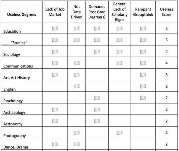 Then we come to the odious top of the table. Communications is no more than an English degree, stripped of any scholarly rigor and diluted with multi-media focus to a ridiculous easy-pass version. As one wit quipped, the only purpose of sociologists is to breed more sociologists. Any degree which ends in the trigger word “studies” is a contrived pyramid scheme, manufactured to wring money out of the student’s bank account while simultaneously fostering an entitled, sullen, negative view of life. This scam only seemed to be viable while corporations fell for the DEI grift. But all pyramid schemes collapse eventually. Those with black-, queer-, women-, media-, fill-in-the-blank studies degrees are left holding the bag.