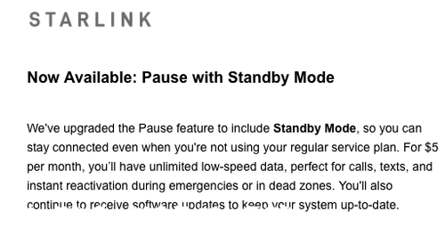 Starlink has introduced a new $5-per-month "Standby Mode," giving customers unlimited low-speed data for calls, texts, and instant reactivation during emergencies or in dead zones, according to a new company email.