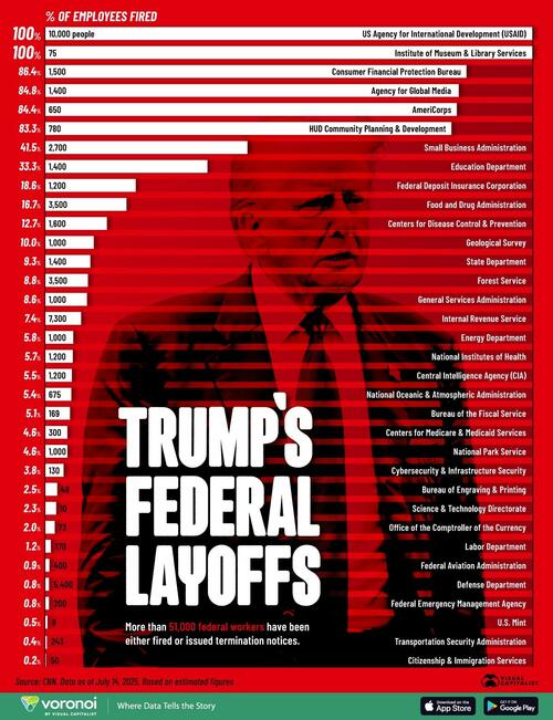 This graphic, via Visual Capitalist’s Dorothy Neufeld, shows Trump’s federal layoffs, based on data from CNN.
