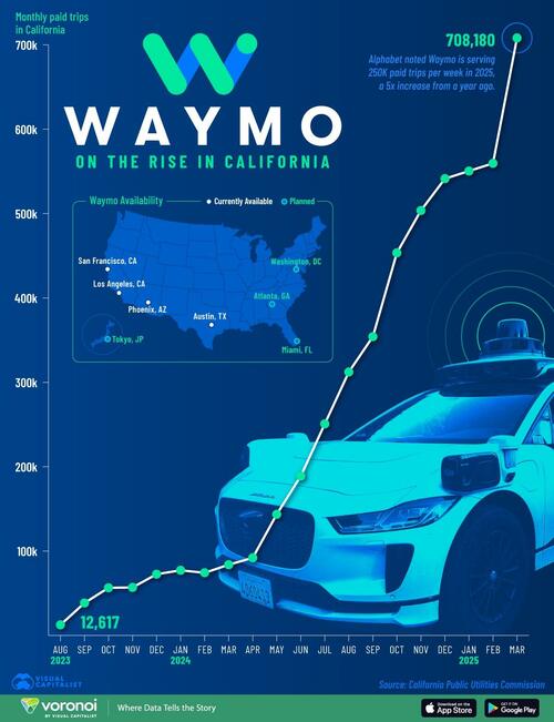 This chart, via Visual Capitalist's Kayla Zhu, visualizes the number of monthly paid Waymo trips in California from August 2023 to March 2025, and a map of the cities that Waymo current operates in and plans to operate in.