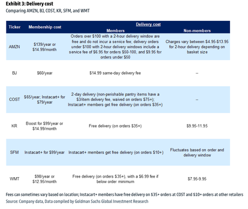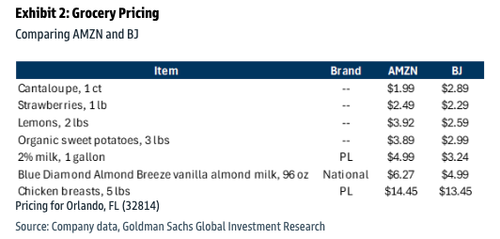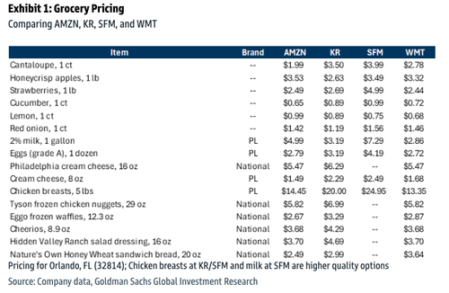 In a separate note, Goldman analyst Kate McShane ran a pricing survey across broadline retailers (BJ's, Walmart) and grocery chains (Kroger, Sprouts) on select items.