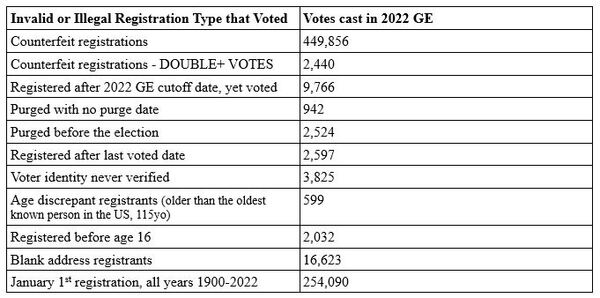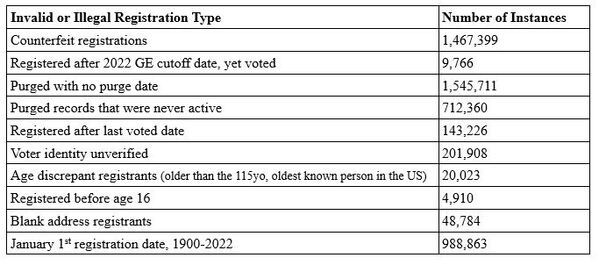 Here are about 5 million of the seemingly invalid and illegal registrations we found. At the top is “counterfeit registrants.” These are new registrations based on a particular voter who already has a record in the database. So now we have two or more unique voters who are really the same. Every one of these appears to be contrary to federal and state laws. If you want to know which laws, read our 2022 report, “The Reign of Error.”