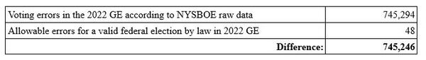 So the voter rolls in New York are not accurate. The votes cast may not have been from eligible voters. The number of voters who voted does not appear to match the number of votes counted. We have one standard remaining to check: Was New York’s 2022 election valid under the law? To be valid, a federal election, remember, can have no more than 1/125,000 ballots in error. The 2022 election in New York had 5.6 million votes counted, so they are allowed 48 ballots in error. How did they do?