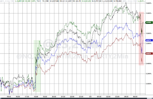 US main equity indices slid a bit after the headlines hit, but overnight gains have largely been maintained amid elevated trade optimism from President Trump’s series of Truth Social posts.