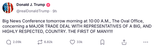 Yet another signal that the trade war has hit its peak came overnight, as President Trump took to Truth Social to tease a "big news conference" Thursday morning, where he plans to unveil a "major deal." As U.S. markets began coming online, Trump continued promoting what he called "a very big and exciting day" for U.S.-U.K. trade.