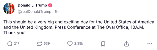 This should be a very big and exciting day for the United States of America and the United Kingdom. Press Conference at The Oval Office, 10 A.M. Thank you!