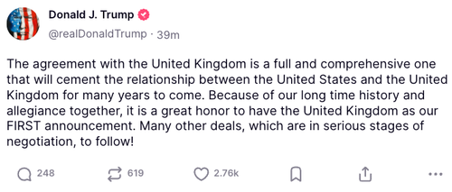 • “Today’s agreement with the UK is the first in a series of agreements on trade,” Trump says