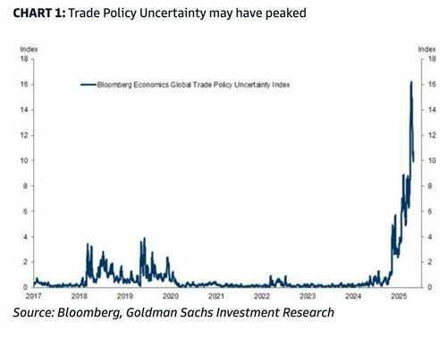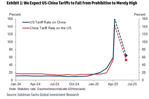 Goldman chief economist Jan Hatzius noted earlier this week: “The mood music with China has improved, and we expect the U.S. tariff rate on China to drop from around 160% to around 60% relatively soon. (China is likely to reduce tariffs on the U.S. by a similar amount.)”