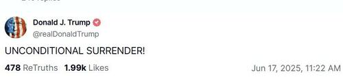 Or is this all one big game of [nuclear] chicken, where the hope is that Iran will suddenly raise the white flag? Trump is now suggesting that Israel and the US could go all in until there's nothing short of "unconditional surrender!"...