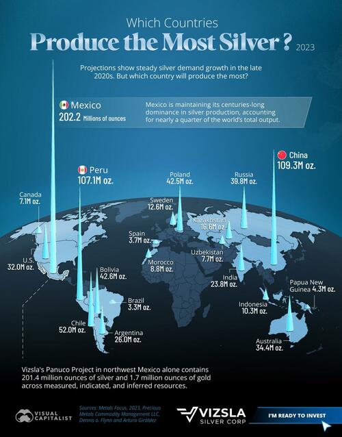 This map, created by Visual Capitalist's Ryan Bellefontaine in partnership with Vizsla Silver Corp., uses the latest data from Metals Focus in the Silver Institute’s World Silver Survey to show the countries producing the most silver.