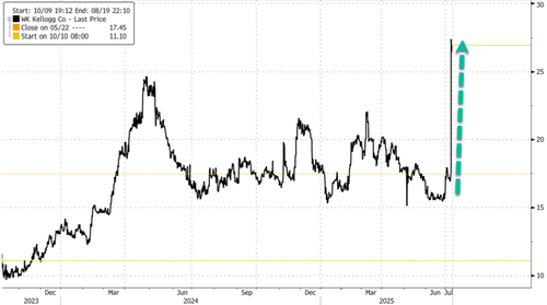 Shares of WK Kellogg Co., the cereal maker behind Froot Loops, Frosted Flakes, and Rice Krispies, surged in premarket trading Thursday following overnight reports that Ferrero International SA is close to acquiring the company in a deal valued at around $3 billion.