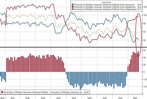 Both Democrats and Republican saw optimism slide (with Independents rising) but the spread between Dems and Reps now at a record high…