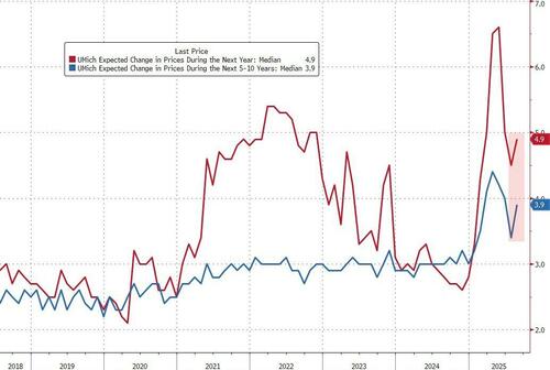 After plunging back to reality for two months, inflation expectations surged back higher in August with year-ahead inflation expectations rose from 4.5% last month to 4.9% this month and long-run inflation expectations also lifted from 3.4% in July to 3.9%…