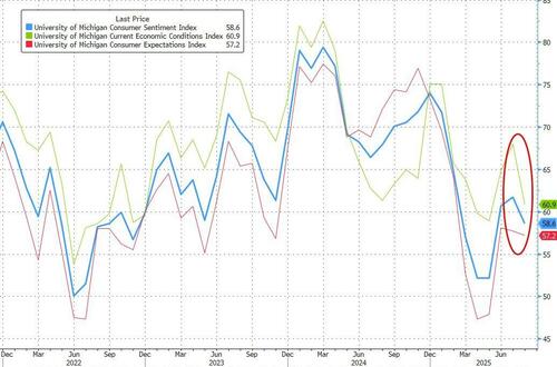 US consumer sentiment tumbled from five month highs in preliminary August data, down (for the first time in four months) from 61.7 to 58.6 (62.0 exp) with both Current Conditions and Expectations declining...