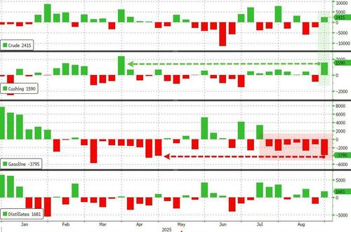 The official DOE data shows a very mixed bag with a big surprise crude build, large jump in stocks at the Cushing Hub and a big draw in gasoline stocks….