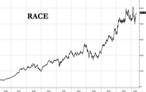 While most global car companies – even Tesla – are suspending guidance, cursing tariffs for plunging demand and barely treading water at a time when Chinese dumping of its own cars has flooded the European market with ultra cheap alternatives while Democrats in the US have sworn to never again buy anything from Elon Musk, one car company stands above all others. Shares of Italian supercar maker Ferrari rose over 1.0%, and was trading not far below its all time high, after the Italian luxury carmaker reported Ebitda for the first quarter that met analyst estimates, with Bernstein saying the company stands out against rivals after it maintained its guidance.